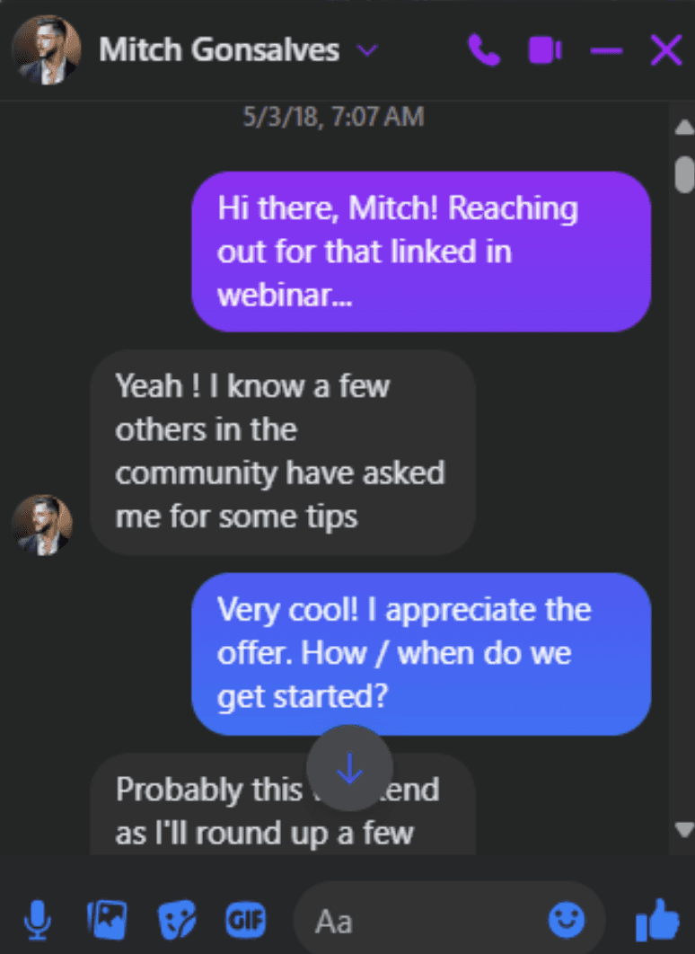 I was super excited, trying to figure out LinkedIn, so I put a post out to the group asking if anyone would be open to sharing their strategy, and one person stood out: Mitch Gonsalves. Instead of just replying with a couple of tips, he decided to do a full-on webinar walking through his entire process. That’s just who he is.