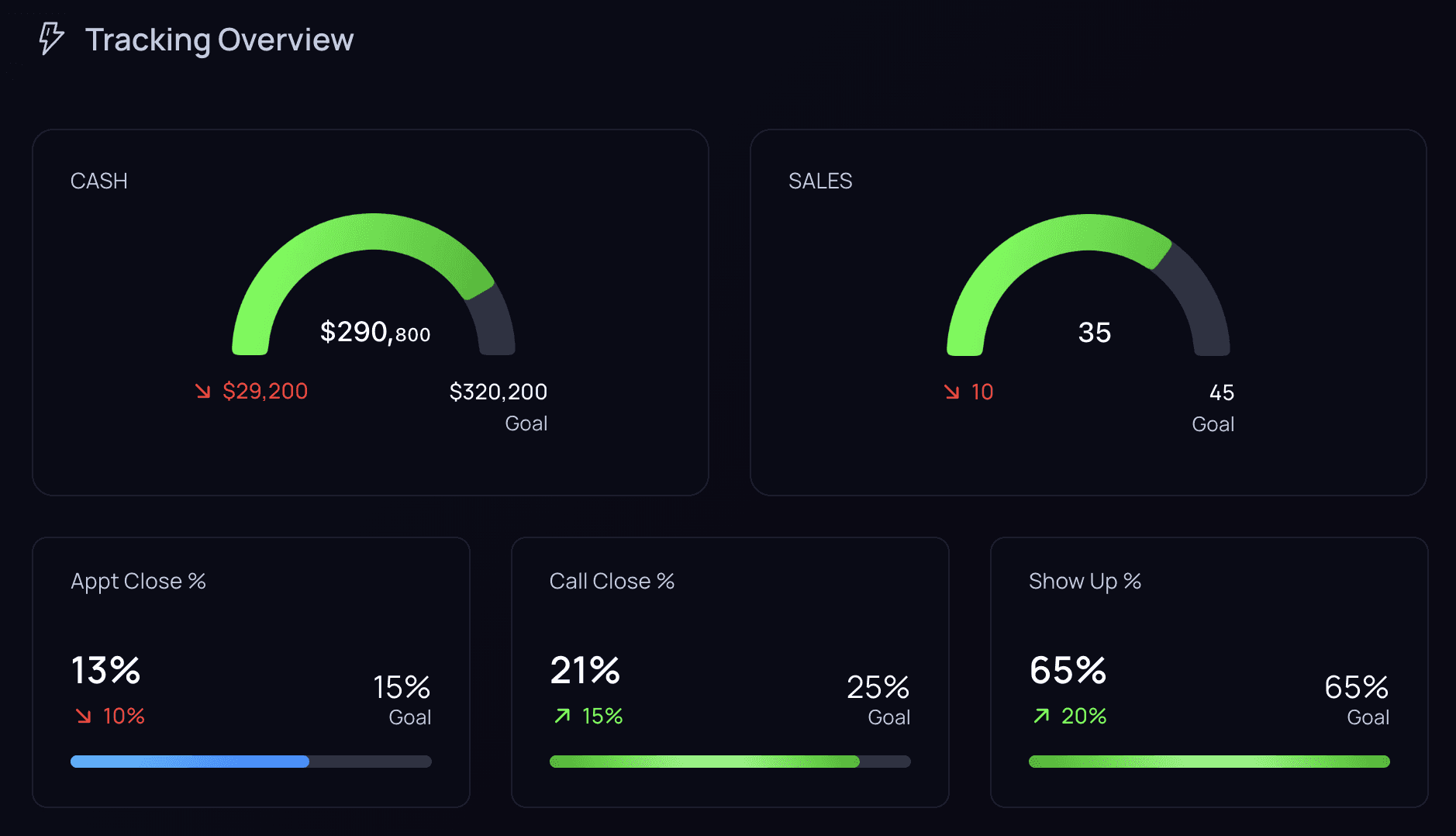 You will have a Sales Dashboard to easily view how you're performing, your progress to your goals for each KPI and overall sales targets, and gain valuable insights to drive sales and increase your conversion rate.